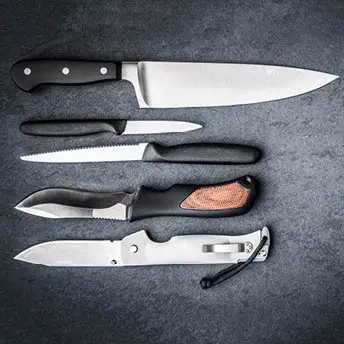 Facas de cozinha, açougue, chef e industriais. Reafiamos com ângulo ideal para cada tipo de corte, garantindo desempenho superior e segurança no manuseio.
